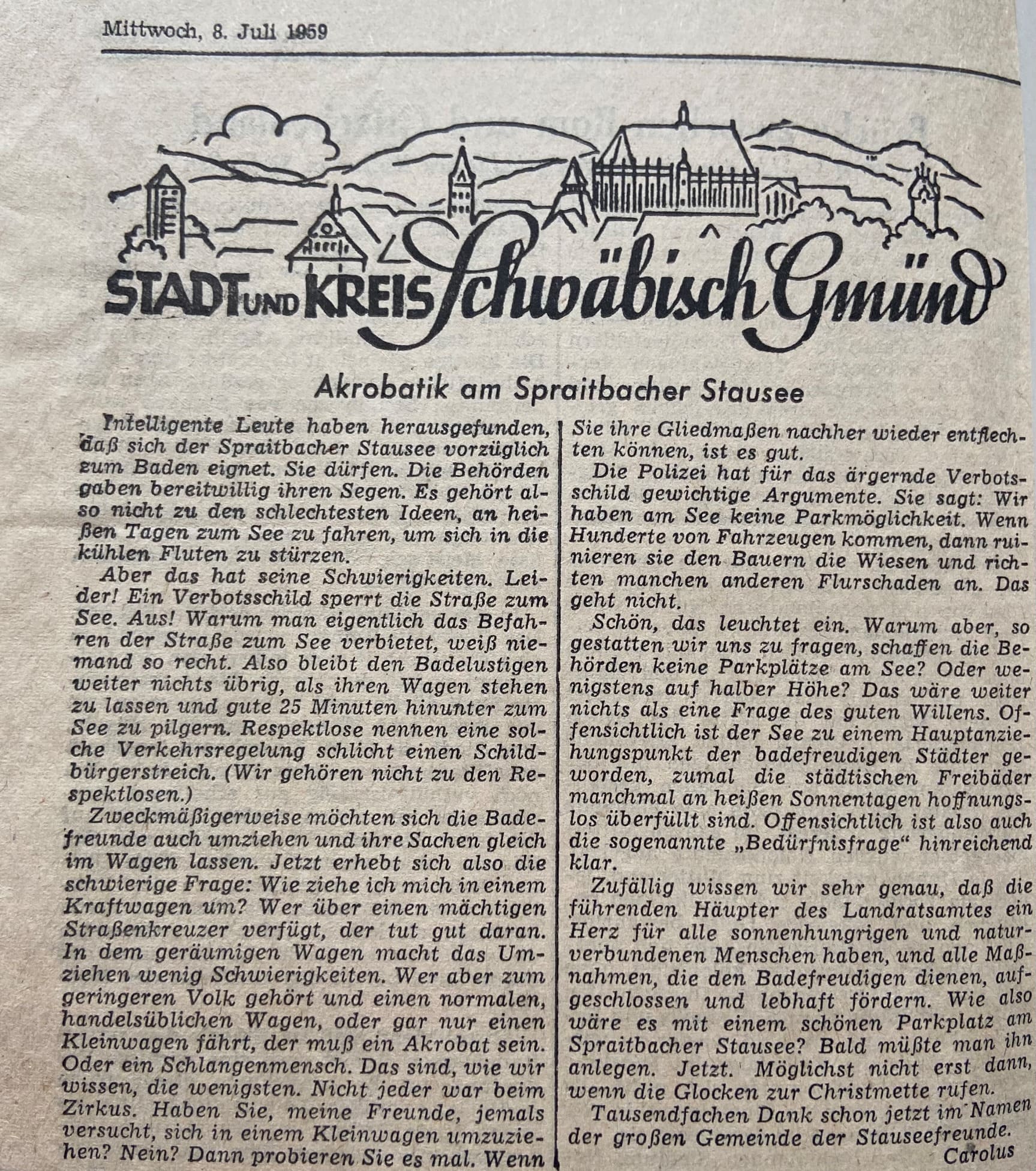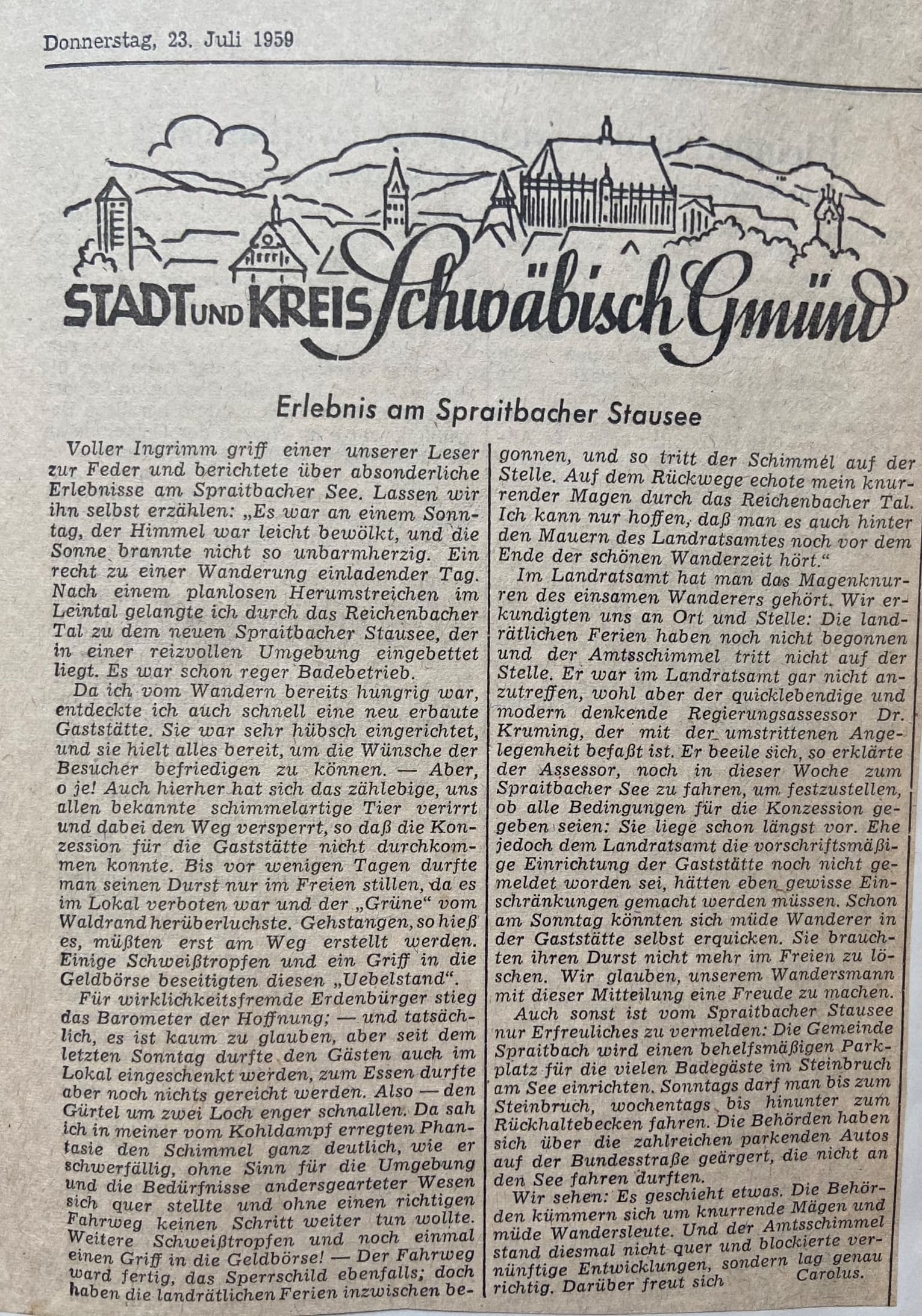 Am 25. Juni 1959 wird der neu erbaute Reichenbach-Stausee eingeweiht. Am 17. April 1959 wird die Vollendung des Rückhaltebeckens bekannt gegeben. Kurz darauf, am 28. Juni, findet am neuen See ein „Strandfest“ statt, und schon am 10. Juli muss der Gemeinderat wegen zu starkem Verkehrsaufkommen, vor allem an Sonntagen, auf der Beutenmühlenstraße eine Sperrung bzw. einschränkende Parkregelungen beschließen. An Sonntagen werden sogar Parkwächter eingesetzt.