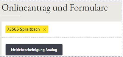 Im Portal suchen Sie dann nach der gewünschten Leistung. Im Feld „Onlineantrag und Formulare“ unsere Postleitzahl (73565) eingeben, dann erscheint ein scharzer Button, wenn wir diese Leistung bereits anbieten. Felder ausfüllen und den Antrag abschicken. Die Antwort erhalten Sie in Ihr Postfach auf Service BW.
