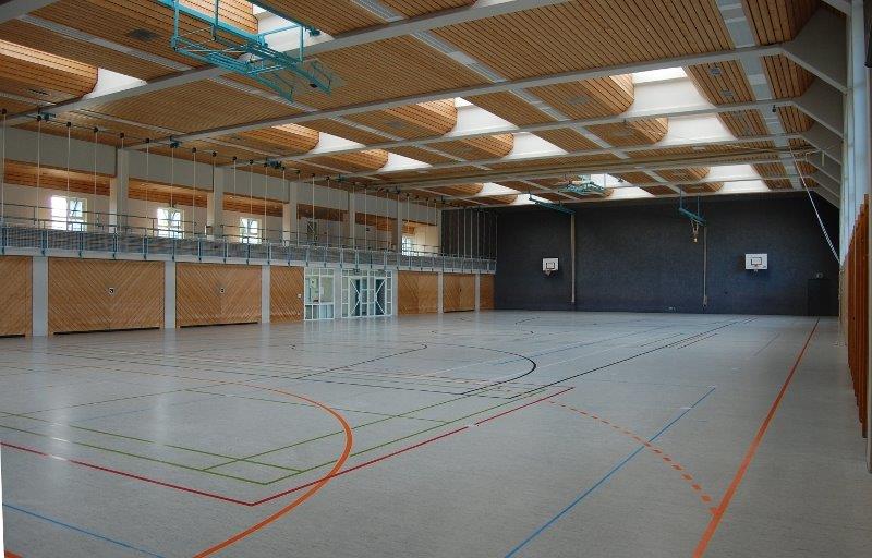 In dieser dreiteiligen Sporthalle können die vielfältigen Sportarten wie z.B. Fußball, Handball, Volleyball, Tischtennis praktiziert werden, es kann sogar Tennis gespielt werden. Auch Sportveranstaltungen und Turniere können aufgrund der großzügig vorhandenen Umkleide- und Duschräume, der Zuschauertribüne und einer Küche problemlos durchgeführt werden.
