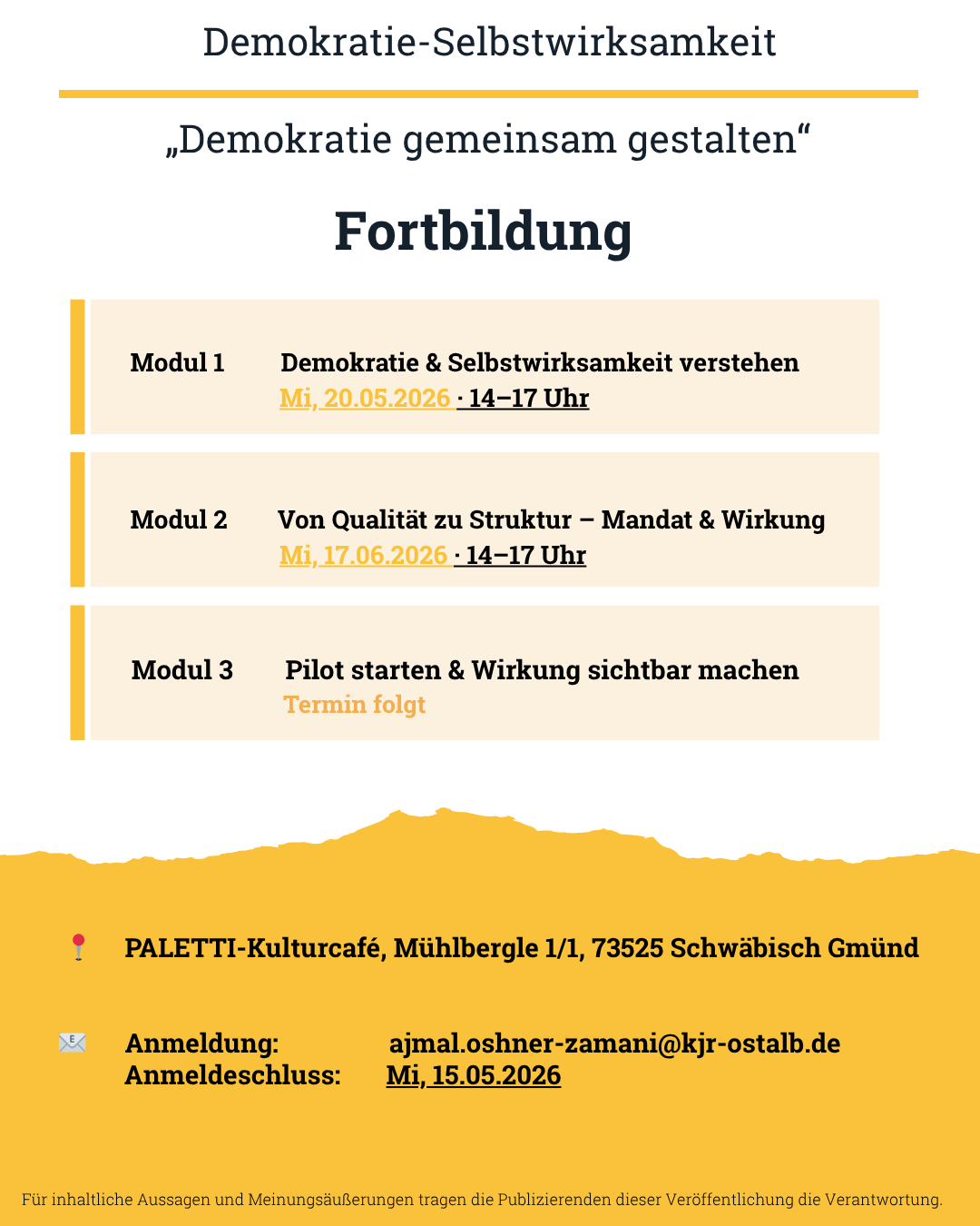 Demokratie lebt davon, dass Menschen sich einbringen – und erleben, dass ihre Stimme zählt. In dieser Fortbildungsreihe stärken wir Demokratie-Selbstwirksamkeit: Wir klären, warum Beteiligung oft folgenlos wirkt, wie echte Mitgestaltung gelingt und wie Beteiligungsprozesse so aufgebaut werden, dass sie verlässlich, transparent und inklusiv sind.