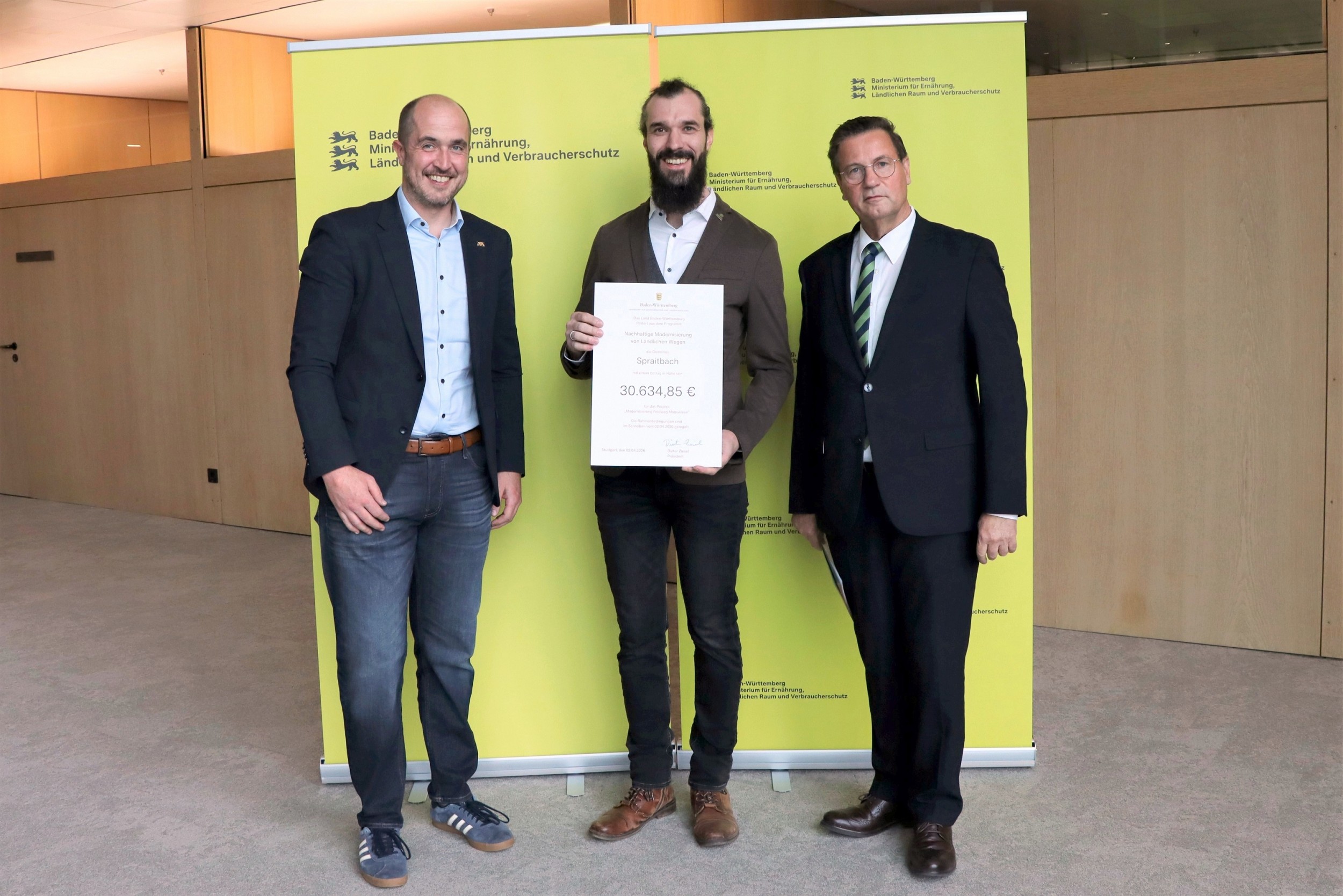 Am 13.04.2026 erhielt BM Johannes Schurr im Ministerium von Ernährung, Ländlicher Raum und Verbraucherschutz in Stuttgart einen Zuschuss für die Modernisierung von ländlichen Wegen in Spraitbach in Höhe von 30.634,85 € (hier Feldweg Mooswiese). Die Übergabe erfolgte durch Minister Peter Hauk MdL und Herrn Tim Bückner MdL.
