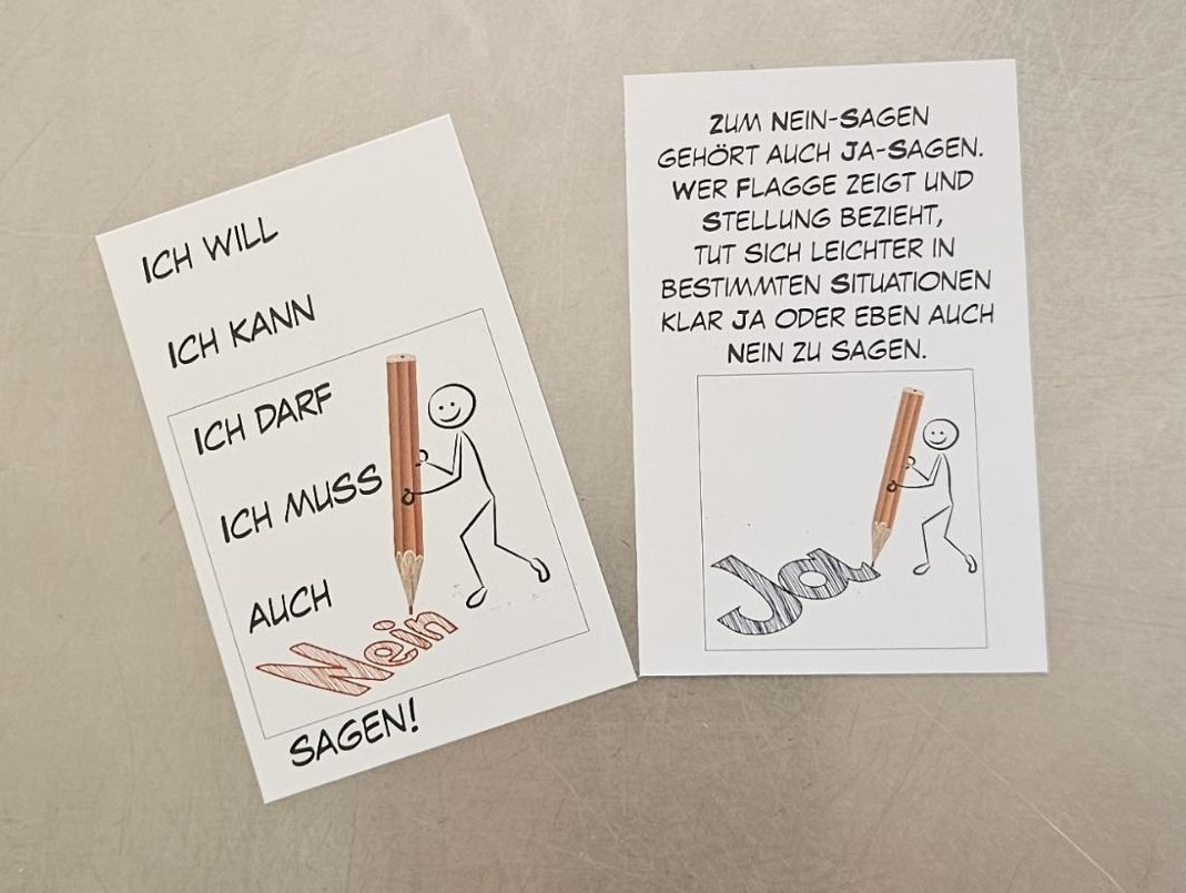 Auf der Rückseite wurde ergänzt, dass zum Nein-Sagen auch das Ja-Sagen gehört. Wer Haltung zeigt und klar Stellung bezieht, tut sich in vielen Situationen leichter, bewusst Ja oder eben auch Nein zu sagen.