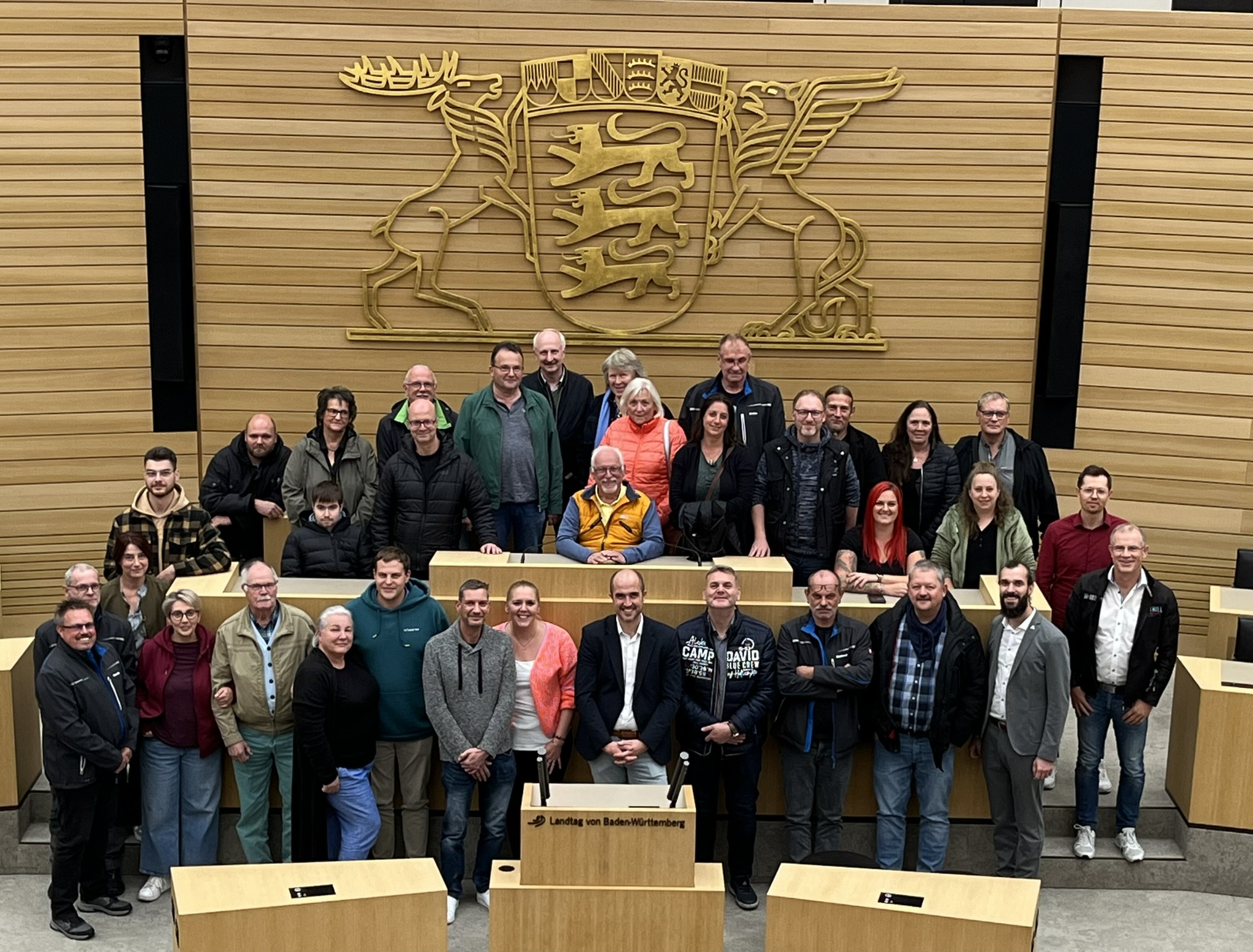 Auf Einladung von Tim Bückner MdL waren Mitglieder der Schachfreunde Spraitbach und des Fischereiverein Spraitbach am 10.10. zu einer Führung in Landtag in Stuttgart eingeladen. Ebenfalls dabei waren der Bürgermeister Johannes Schurr, die Gemeinderäte Doris Kurz und Stefan Mord sowie weitere interessierte Bürger. Mit einem Reisebus ging es frohgelaunt in zügiger Fahrt nach Stuttgart, wo die Gruppe herzlich willkommen geheißen wurde. Nun ging es gemeinsam hinein in den Landtag, wo nach ersten Erklärungen im Sitzungssaal Platz genommen werden konnte. Von Tim Bückner wurde in ruhigen, sachlichen Ausführungen die Arbeit eines Landtagsabgeordneten sowie des Landtags ausführlich erläutert. In der anschließenden Fragerunde blieb er keine Antwort auf alle Fragen schuldig. Dann ging es durch einen Tunnel unter der Straße hindurch zum Abgeordnetenhaus und den dort befindlichen Fraktionsräumen und Abgeordnetenbüros. Die Teilnehmer stauten nicht schlecht, welch umfangreiche Organisation vorhanden ist. Auch welche umfassenden Vorgehensweisen sich im Landtag abspielen fanden die Teilnehmer beeindruckend. Beim anschließenden gemeinsamen Abendessen wurde der Tage nochmal resümiert. Tim Bückner zeigte sich zum Schluss erfreut über die „junge Gruppe“ die im sicherlich noch langen in Erinnerung bleiben wird und dankte auch den Organisatoren Hans und Alex, die diese Veranstaltung erst ermöglicht haben. Als Dank der Gemeinde Spraitbach überreichte Johannes Schurr an den Gastgeber noch ein paar „Spraitbacher Socken“, die er freudig in Empfang nahm.