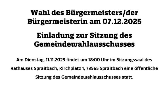 Am Dienstag, 11.11.2025 findet um 18:00 Uhr im Sitzungssaal des Rathauses Spraitbach, Kirchplatz 1, 73565 Spraitbach eine öffentliche Sitzung des Gemeindewahlausschusses statt.