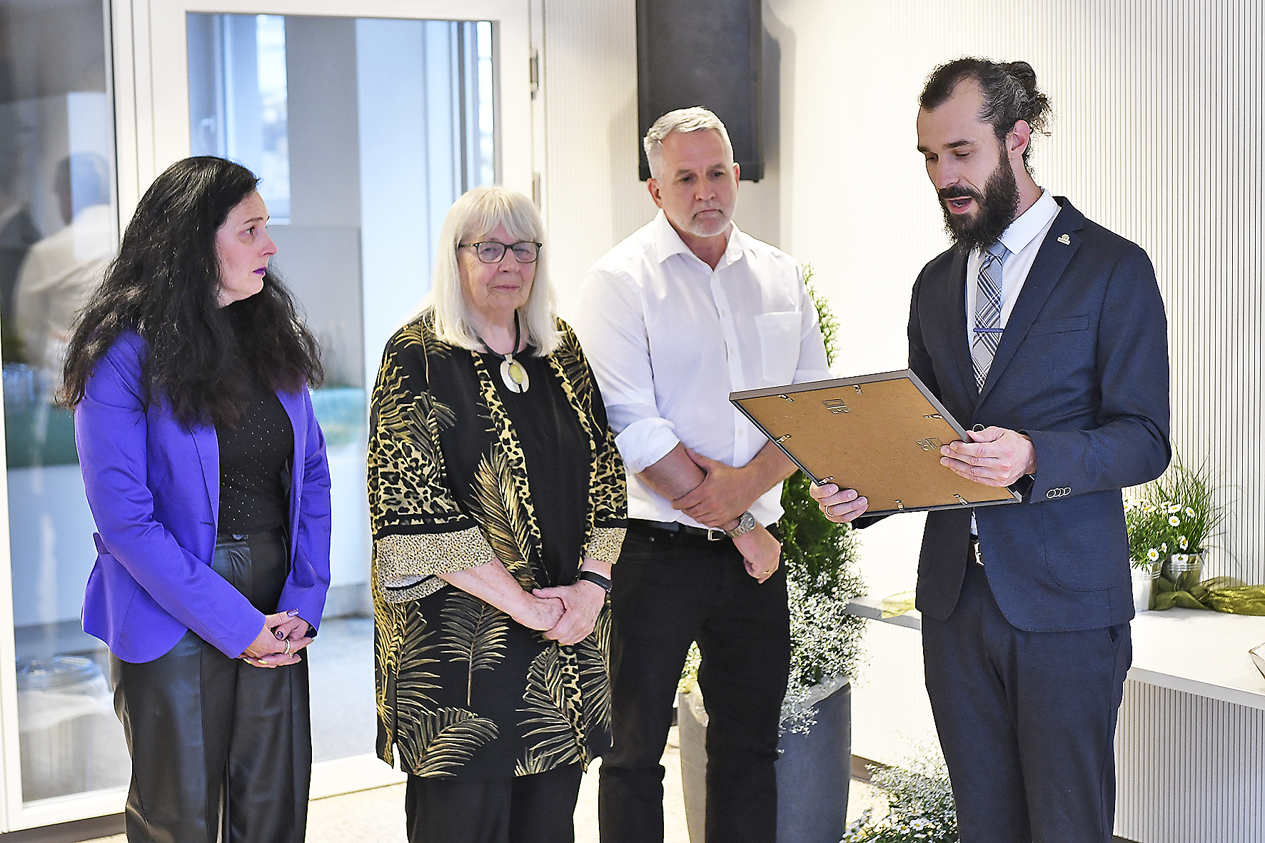 Bürgermeister Johannes Schurr erinnerte an persönliche Gespräche mit Herrn Pommerenke – oft begannen sie mit „Haben Sie 15 Minuten?“ und wurden zu Stunden des gemeinsamen Nachdenkens über Bildung, Gesellschaft und Verantwortung. Für ihn war Bildung der Schlüssel zu einer gelingenden Gesellschaft. Sein Wunsch: Dass sich möglichst viele diesem Ziel widmen.