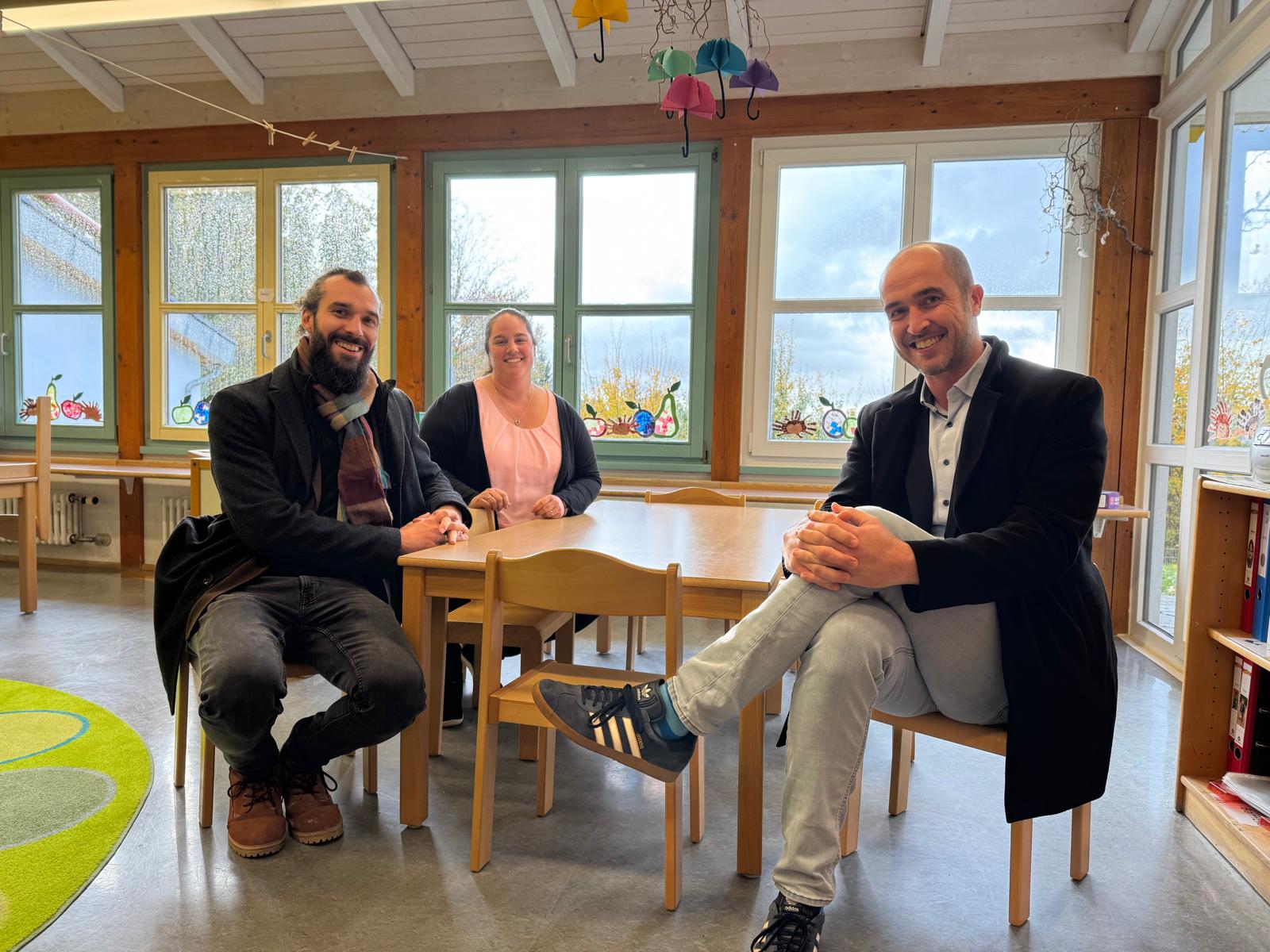 Anschließend führte der Weg in den Gemeindekindergarten, wo sich Bückner einen Eindruck von der pädagogischen Arbeit und der räumlichen Ausstattung verschaffte. Gemeinsam mit der Einrichtungsleitung und dem Bürgermeister sprach er über die Herausforderungen in der frühkindlichen Bildung, insbesondere in Bezug auf Personalgewinnung und natürlich der anstehenden Sanierung.