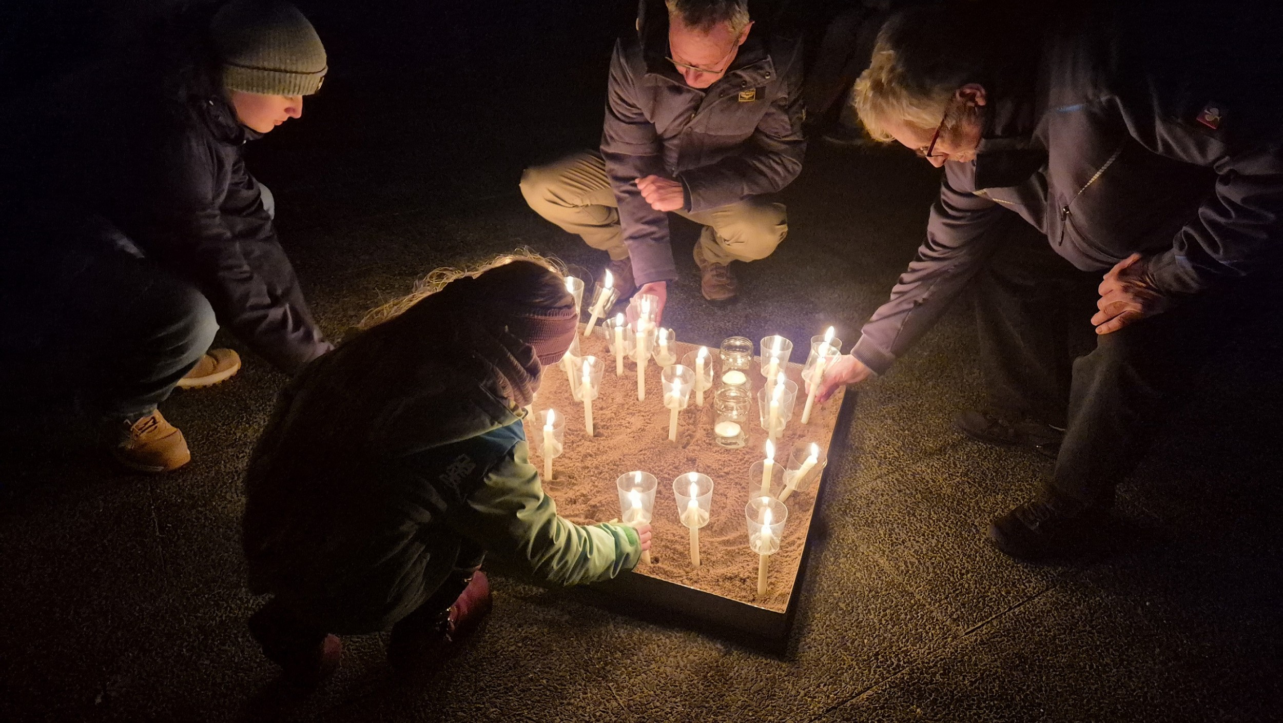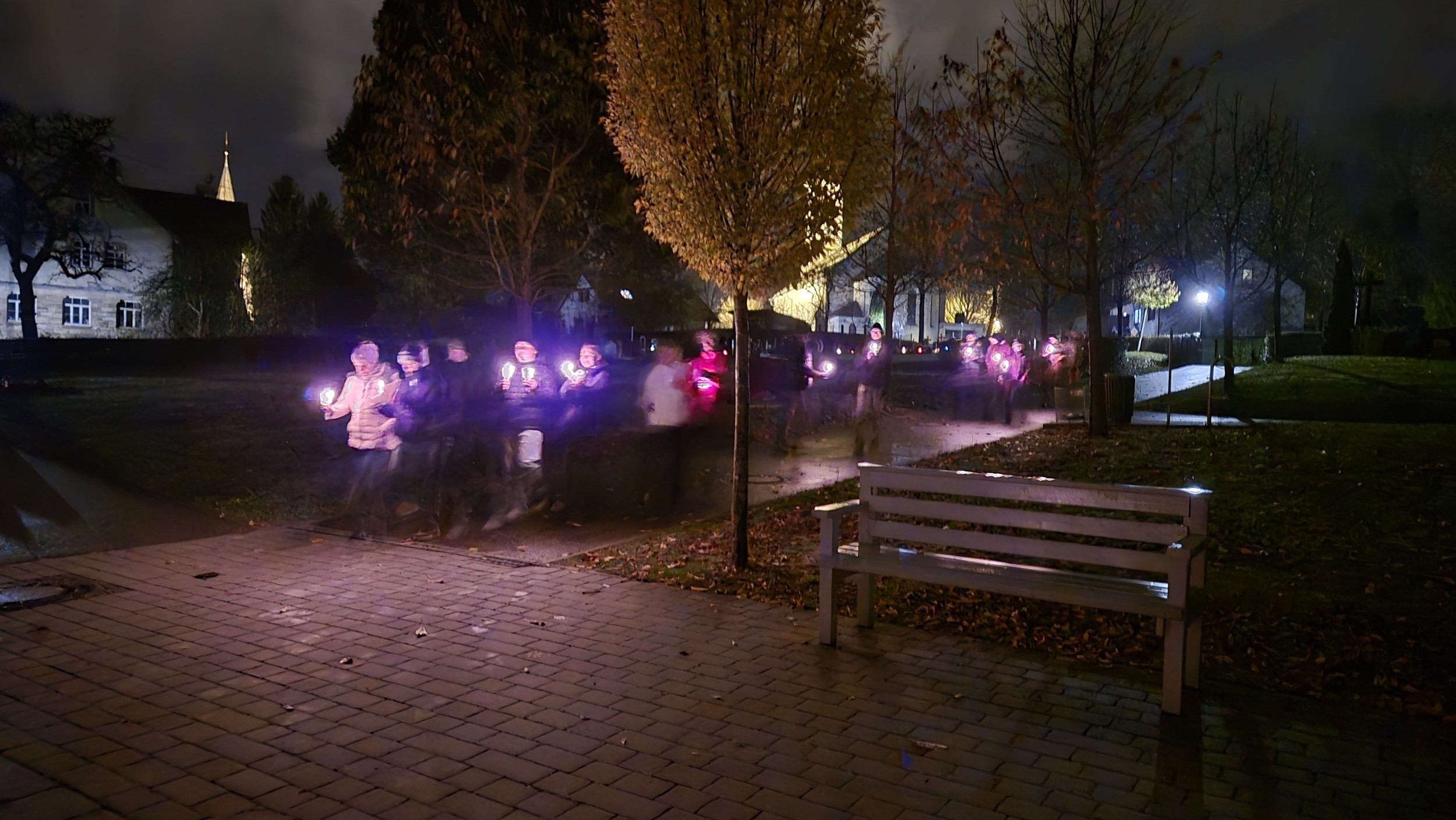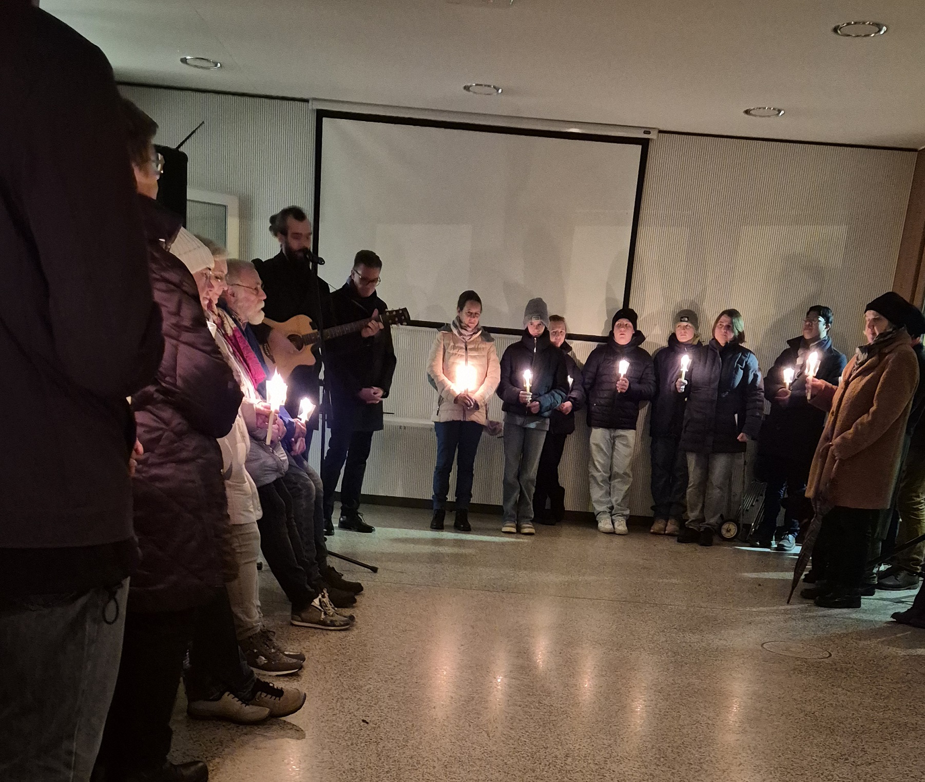 In diesem Jahr war auch Landrat Dr. Bläse anwesend und traf um 17:30 Uhr zur Gruppe um die Pfarrer der geistlichen Gemeinden und den Bürgermeister. Nach seiner Begrüßung richtete der Bürgermeister einige nachdenkliche Worte an die Menge, die sich wetterbedingt im Bürgersaal versammelt hatte. Gefolgt von Gedanken des Landrats, der aus verschiedenen Blickwinkeln aufzeigte, wie Frieden gelingen könnte bzw. was dazu beigetragen werden kann. Von der Gitarre begleitet sang die Menge Hevenu Shalom Aleichem während der letzten Kerzen ausgeteilt wurden. Gemeinsam führte der Weg auf den Friedhof, wo die Kerzen in der Aussegnungshalle abgestellt wurden. Von Pfarrer Wilson begaben sich die Friedensbewahrer auf den Nachhauseweg.
